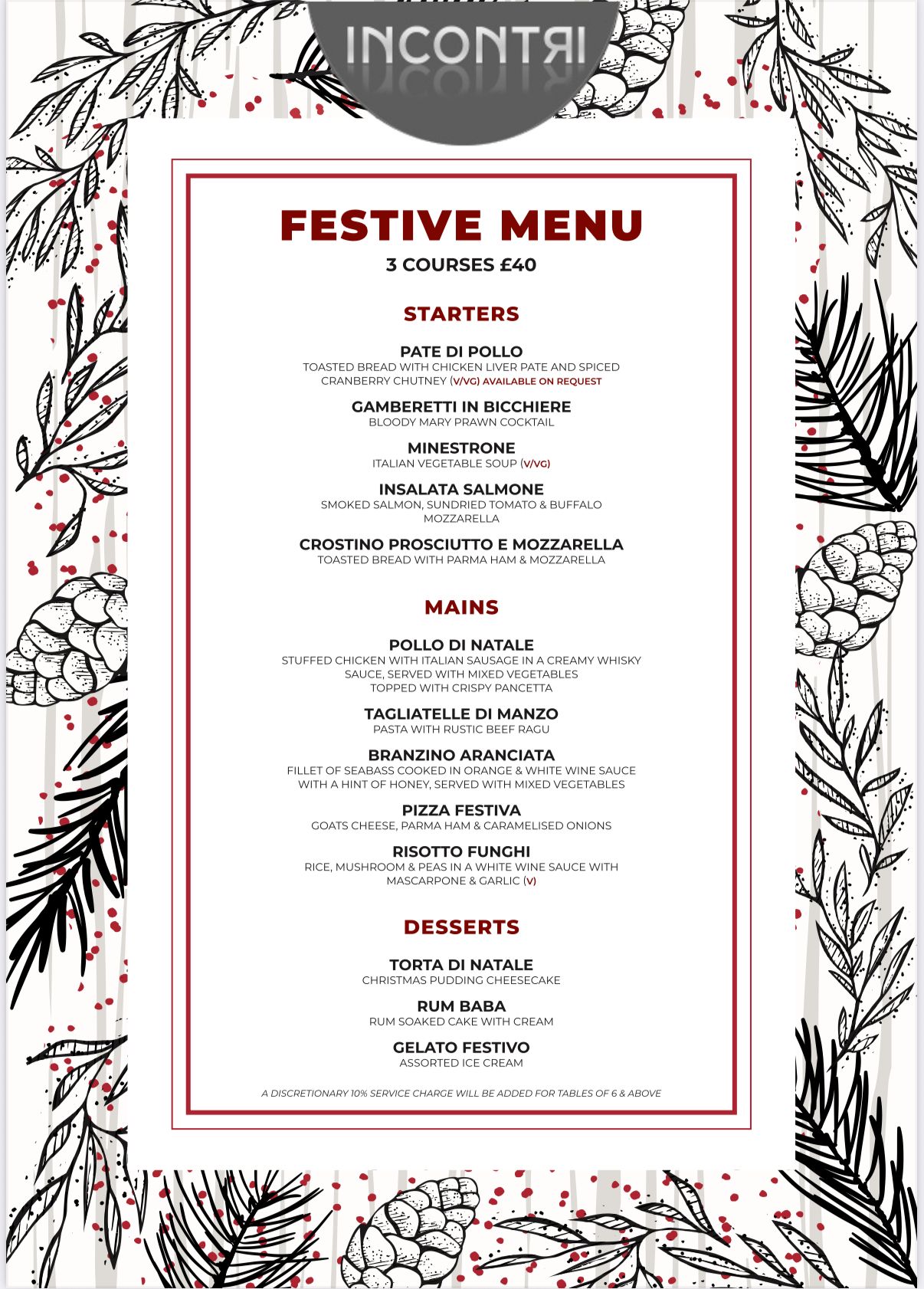 View Menus NEW April 2025 A La Carte & Children's Menu Our A La Carte menu is available, with new additions, plus the returning favourites. NEW Menu NEW Festive 2025 Menu Getting ready to celebrate the festivities.... Join us at Incontri View Menu